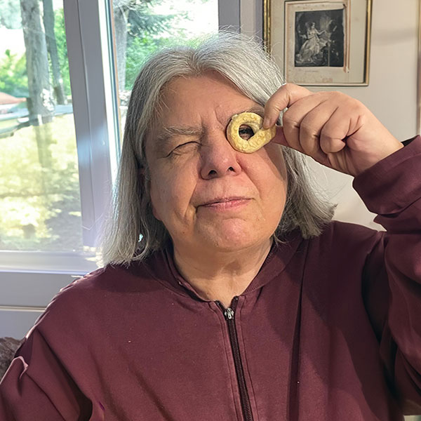 Giuditta ha 58 anni, vive con sua sorella Veronica e la gatta Giumbina. Adora le radio perché emettono musica, la piscina perché la fa sentire leggera e la pasta perché è buona. Va ovunque con un borsone in cui tiene i suoi giochi transizionali, le mancano tanto mamma e papà che sono “da Gesù”.