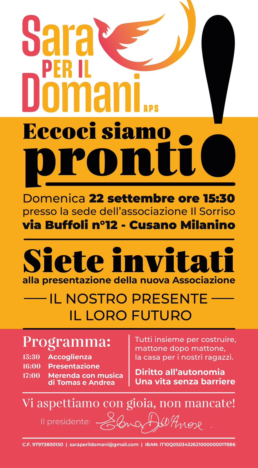 “Eccoci, siamo pronti!” è l’evento speciale creato per farvi conoscere da vicino la nostra associazione e il nostro impegno. Vi aspettiamo con grande entusiasmo alla presentazione che si terrà domenica 22 settembre alle ore 15:30, presso la sede dell’associazione Il Sorriso, in Via Buffoli 12 a Cusano Milanino.